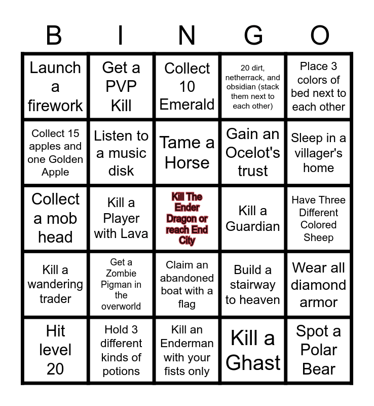 This bingo card has a free space and 24 words: Get a Zombie Pigman in the overworld, Hold 3 different kinds of potions, Tame a Horse, Hit level 20, Place 3 colors of bed next to each other, Launch a firework, Collect 15 apples and one Golden Apple, Get a PVP Kill, Kill a Guardian, Claim an abandoned boat with a flag, Gain an Ocelot's trust, Collect a mob head, Build a stairway to heaven, Wear all diamond armor, Listen to a music disk, Kill a Ghast, Have Three Different Colored Sheep, Collect 10 Emerald, Sleep in a villager's home, Kill a Player with Lava, Spot a Polar Bear, Kill a wandering trader, 20 dirt, netherrack, and obsidian (stack them next to each other) and Kill an Enderman with your fists only.