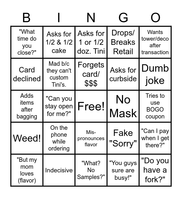This bingo card has a free space and 29 words: "But my mom loves (flavor), "Can I have this delivered today?", "Can you stay open for me?", "That's all you have?", "What time do you close?", Asks for 1 or 1/2 doz. Tini, Mad b/c they can't custom Tini's., On the phone while ordering, No Mask, Indecisive, Tries to use BOGO coupon, "Do you have a fork?", "What? No Samples?", "You guys sure are busy!", Dumb joke, Wrong name on order, Mis-pronounces flavor, Weed!, Wants tower/deco after transaction, Adds items after bagging, Fake "Sorry", Man in a PANIC!, Asks for curbside, Card declined, Drops/ Breaks Retail, Asks for 1/2 & 1/2 cake, "Can I pay when I get there?", Forgets card/ $$$ and Pulls on door before/after store hours.