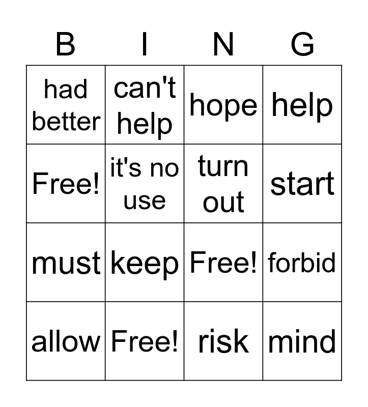 This bingo card has 16 words: Free!, forbid, hope, had better, must, can't help, Free!, risk, Free!, it's no use, allow, help, keep, start, turn out and mind.