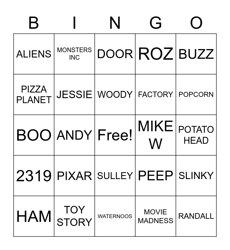 This bingo card has a free space and 24 words: PIXAR, TOY STORY, WOODY, HAM, BUZZ, ALIENS, PIZZA PLANET, MONSTERS INC, MIKE W, SULLEY, FACTORY, BOO, PEEP, SLINKY, JESSIE, MOVIE MADNESS, POTATO HEAD, DOOR, POPCORN, ANDY, RANDALL, 2319, ROZ and WATERNOOS.