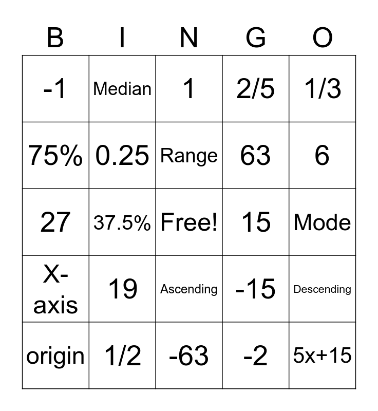 This bingo card has a free space and 24 words: 19, 1/2, Range, origin, 1/3, -1, 75%, Median, 15, Ascending, 63, 27, -15, Descending, 0.25, -2, Mode, 1, 6, 37.5%, 5x+15, X-axis, 2/5 and -63.