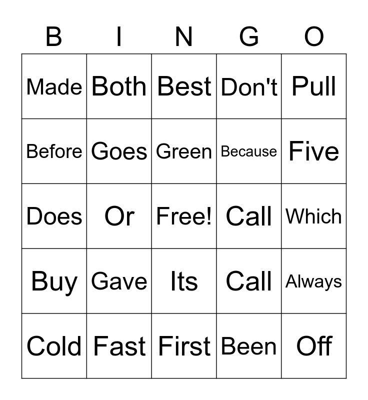 This bingo card has a free space and 28 words: Always, Around, Because, Been, Before, Best, Both, Buy, Call, Cold, Does, Don't, Fast, First, Five, Found, Gave, Goes, Green, Its, Made, Many, Off, Or, Which, Call, Pull and Why.
