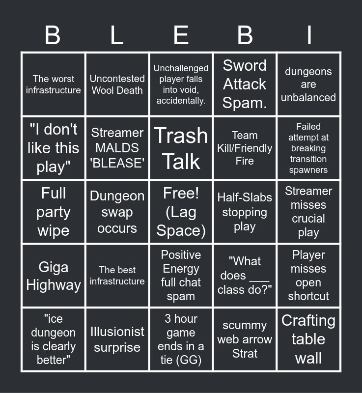 This bingo card has a free space and 24 words: The best infrastructure, Illusionist surprise, Trash Talk, "ice dungeon is clearly better", dungeons are unbalanced, The worst infrastructure, "I don't like this play", Uncontested Wool Death, Half-Slabs stopping play, Positive Energy full chat spam, Team Kill/Friendly Fire, Full party wipe, "What does ___ class do?", Player misses open shortcut, Streamer MALDS 'BLEASE', scummy web arrow Strat, Streamer misses crucial play, Unchallenged player falls into void, accidentally., Failed attempt at breaking transition spawners, Dungeon swap occurs, Crafting table wall, Giga Highway, Sword Attack Spam. and 3 hour game ends in a tie (GG).