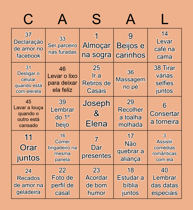 This bingo card has a free space and 49 words: 4 Quilos extras e gordurinhas a mais, 19 Gargalhar de alegria, 20 Ver o por do sol abraçados, 18 Estudar a bíblia juntos, 6 Consertar a torneira, 35 Assistir política com ele, 33 Ser parceiro nas furadas, 2 Dormir de conchinha, 36 Massagem no pé, 32 Fazer exercícios juntos, 31 Desligar o celular quando está com ele/ela, 39 Lembrar do 1º beijo, 17 Não quebrar a aliança, 40 Lembrar das datas especiais, 27 Assistir Futebol com ele, 28 Dividir a escova de dente, 1 Almoçar na sogra, 29 Recolher a toalha molhada, 30 Esperar com paciência enquanto ela faz compras no shopping, 37 Declaração de amor no facebook, 22 Foto de perfil de casal, 23 Acordar de bom humor, 9 Beijos e carinhos, 14 Levar café na cama, 5 Dizer que ela é linda quando acorda, 16 Comer brigadeiro na mesma panela, 25 Ir a Retiros de Casais, 15 Não se irritar com a TPM, 3 Assistir comédias românticas com ela, 11 Orar juntos, 26 INCENTIVO sempre!, 7 Dar presentes, 21 Achar que ela cozinha melhor que a sua mãe, 6 Consertar a torneira, 24 Recados de amor na geladeira, 34 Discutir a relação com alegria, 8 Caminhar juntos na praia, 12 Dividir o yakult, 38 Tirar várias selfies juntos, 42 Dividir as tarefas de casa, 41 Cozinhar para ela, 43 Namorar muito, 44 Sonhar com o futuro, 47 Servir a igreja juntos, 45 Lavar a louça quando o outro está cansado, 46 Levar o lixo para deixar ela feliz, 48 Cuidar das criança enquanto o outro saí, 50 Dar banho no cachorro juntos and 49 Fazer as compras do mercado juntos.