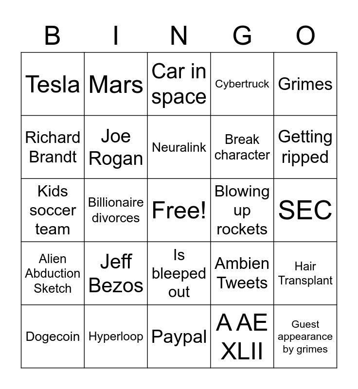 This bingo card has a free space and 24 words: Dogecoin, Jeff Bezos, Neuralink, A AE XLII, Grimes, Tesla, Mars, Car in space, Blowing up rockets, SEC, Kids soccer team, Joe Rogan, Ambien Tweets, Hair Transplant, Richard Brandt, Hyperloop, Paypal, Cybertruck, Getting ripped, Alien Abduction Sketch, Billionaire divorces, Is bleeped out, Break character and Guest appearance by grimes.