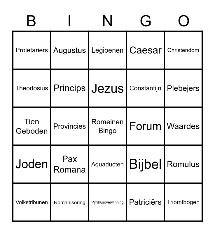 This bingo card has a free space and 29 words: Volkstribunen, Senaat, Provincies, Latijn, Proletariers, Legioenen, Princips, Pax Romana, Forum, Romanisering, Waardes, Triomfbogen, Pyrrhusoverwinning, Patriciërs, Plebejers, Republiek, Aquaducten, Joden, Christendom, Tien Geboden, Bijbel, Nieuwe Testament, Constantijn, Theodosius, Caesar, Augustus, Romulus, Jezus and Colosseum.