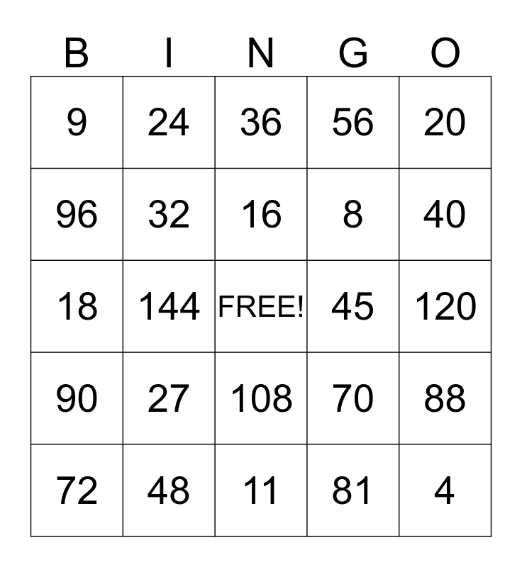 This bingo card has a free space and 24 words: 27, 48, 16, 72, 20, 9, 96, 24, 45, 108, 8, 18, 70, 88, 32, 81, 120, 36, 40, 144, 4, 90, 56 and 11.
