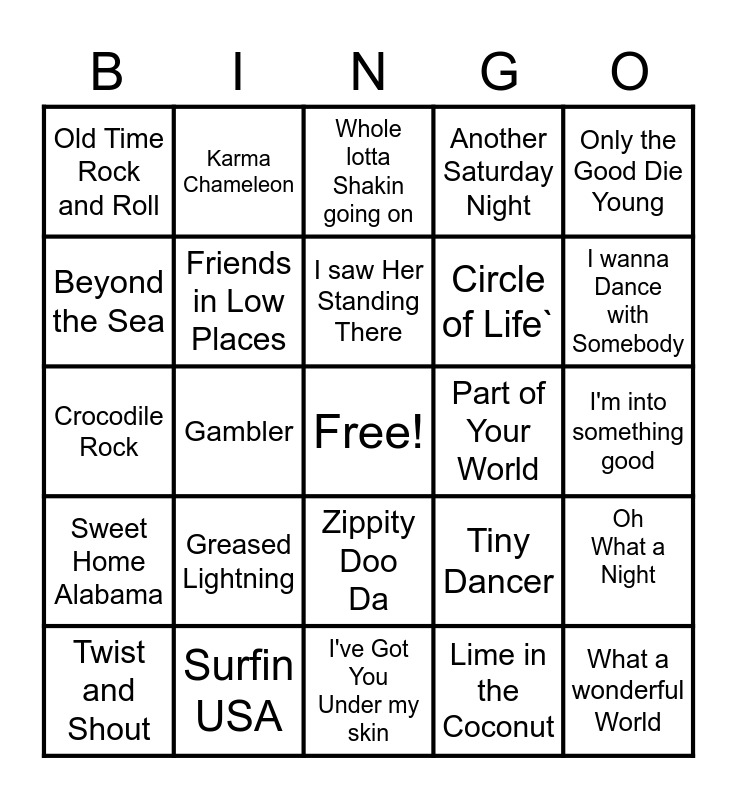 This bingo card has a free space and 24 words: Greased Lightning, Surfin USA, I saw Her Standing There, Twist and Shout, Only the Good Die Young, Old Time Rock and Roll, Beyond the Sea, Karma Chameleon, Part of Your World, Zippity Doo Da, Circle of Life`, Crocodile Rock, Tiny Dancer, Oh What a Night, Friends in Low Places, Lime in the Coconut, I'm into something good, Whole lotta Shakin going on, I wanna Dance with Somebody, Gambler, What a wonderful World, Sweet Home Alabama, Another Saturday Night and I've Got You Under my skin.