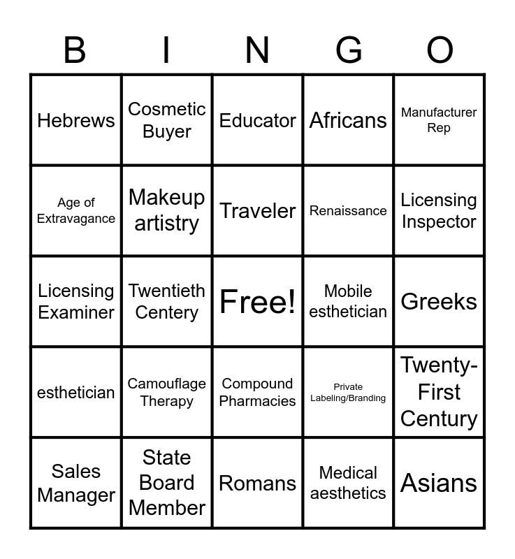 This bingo card has a free space and 34 words: Nanotechnology, Medical aesthetics, henna, esthetics, esthetician, Makeup artistry, Manufacturer Rep, Sales Manager, Cosmetic Buyer, Writer, Traveler, Educator, Skin Care Company Owner, Product Development, Mobile esthetician, Licensing Inspector, State Board Member, Licensing Examiner, Camouflage Therapy, Private Labeling/Branding, Compound Pharmacies, Egyptians, Hebrews, Greeks, Romans, Asians, Africans, Middle Ages, Renaissance, Age of Extravagance, Victorian, Twentieth Centery, Twenty-First Century and Today.
