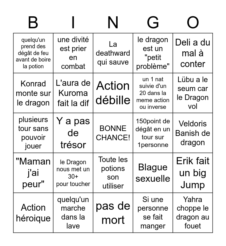 This bingo card has a free space and 24 words: le Dragon nous met un 30+ pour toucher, quelqu'un marche dans la lave, Action débille, Action héroique, Deli a du mal à conter, quelqu'un prend des dégât de feu avant de boire la potion, Konrad monte sur le dragon, une divité est prier en combat, 150point de dégât en un tour sur 1personne, Toute les potions son utiliser, un 1 nat suivie d'un 20 dans la meme action ou inverse, plusieurs tour sans pouvoir jouer, Blague sexuelle, Erik fait un big Jump, L'aura de Kuroma fait la dif, Si une personne se fait manger, Veldoris Banish de dragon, La deathward qui sauve, Lübu a le seum car le Dragon vol, Y a pas de trésor, Yahra choppe le dragon au fouet, "Maman j'ai peur", le dragon est un "petit problème" and pas de mort.