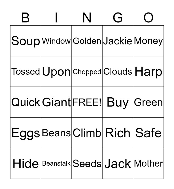 This bingo card has a free space and 24 words: Beans, Beanstalk, Chopped, Hide, Money, Soup, Tossed, Window, Buy, Climb, Clouds, Quick, Rich, Safe, Upon, Jack, Green, Golden, Harp, Giant, Mother, Eggs, Jackie and Seeds.