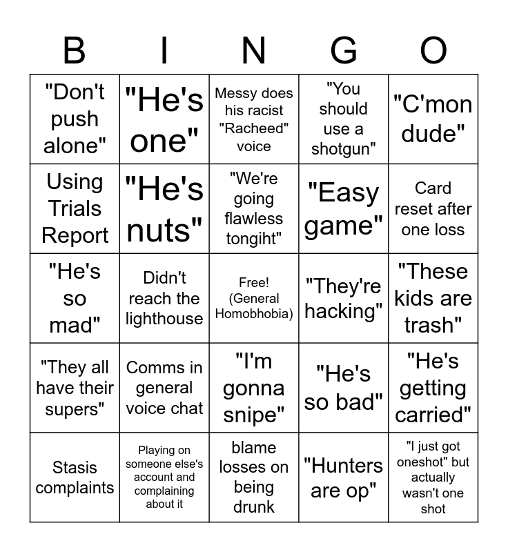 This bingo card has a free space and 24 words: Stasis complaints, Comms in general voice chat, "We're going flawless tongiht", "Hunters are op", "C'mon dude", "Don't push alone", "He's one", Messy does his racist "Racheed" voice, "They're hacking", "These kids are trash", "He's so mad", "He's nuts", "He's so bad", "He's getting carried", Using Trials Report, Playing on someone else's account and complaining about it, blame losses on being drunk, "You should use a shotgun", Card reset after one loss, "They all have their supers", Didn't reach the lighthouse, "I'm gonna snipe", "Easy game" and "I just got oneshot" but actually wasn't one shot.