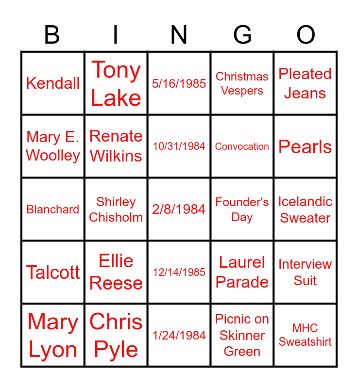 This bingo card has a free space and 74 words: Skinner, Liz Kennan, 10/31/1984, Faculty Show, Sporto Duck Shoes, Williston Library, John Grayson, 12/3/1984, Junior Show, Lanz Nightgown, Mary Lyon, Indira Peterson, Convocation, Pleated Jeans, Pratt, Chris Pyle, 4/23/1985, Founder's Day, Velveteen Blazer, Kendall, Shirley Chisholm, 5/16/1985, Christmas Vespers, Icelandic Sweater, Mary E. Woolley, Lee Bowie, 1/28/1986, Commencement, Print Turtleneck, Willits-Hallowell, Renate Wilkins, 3/6/1986, Pangynaskeia, Sweats, Clapp, Holly Metcalf, 2/28/1983, Parents' Weekend, MHC Sweatshirt, Art Building, Cathy Melhorn, 12/14/1985, Mountain Day, Dorm T-shirt, Dwight, Tony Lake, 10/7/1982, Winterterm, Feathered Bangs, Carr, Lilian Hsu, 11/2/1983, Laurel Parade, Plaid Skirt, Psych-Ed, Leonard DeLonga, 1/24/1984, Gracious Dinner, Swatch Watch, Talcott, Ellie Reese, 10/5/1983, Picnic on Skinner Green, Interview Suit, Blanchard, Peter Viereck, 9/29/1982, Dorm Party, Pearls, Shattuck, Nicole Vaget, 10/2/1985, "Freshman" Hazing and Cap & Gown.