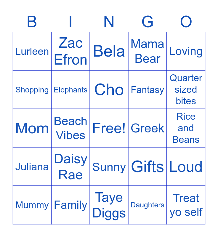 This bingo card has a free space and 27 words: Gifts, Ginger Tea, Fantasy, Taye Diggs, Shopping, Bela, Zac Efron, Juliana, Greek, Loud, Mom, Mama Bear, Mummy, Family, Quarter sized bites, Traveling, Elephants, Cho, Daisy Rae, Lurleen, Rice and Beans, Daughters, Beach Vibes, Treat yo self, Sunny, Loving and Mothers day.