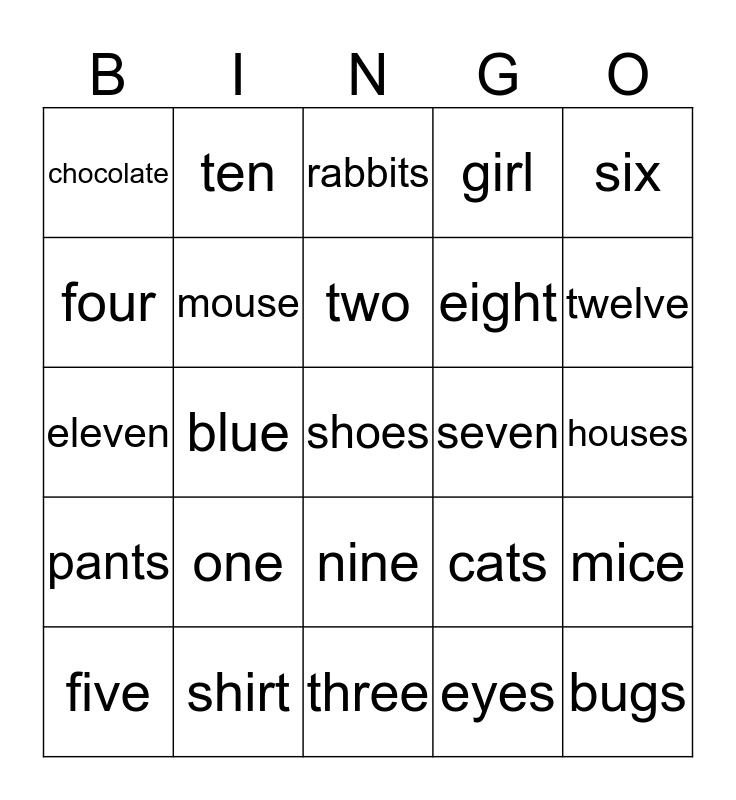 This bingo card has 25 words: one, three, two, five, six, chocolate, four, ten, seven, nine, eight, eleven, cats, mice, mouse, bugs, houses, rabbits, twelve, blue, shoes, shirt, pants, girl and eyes.