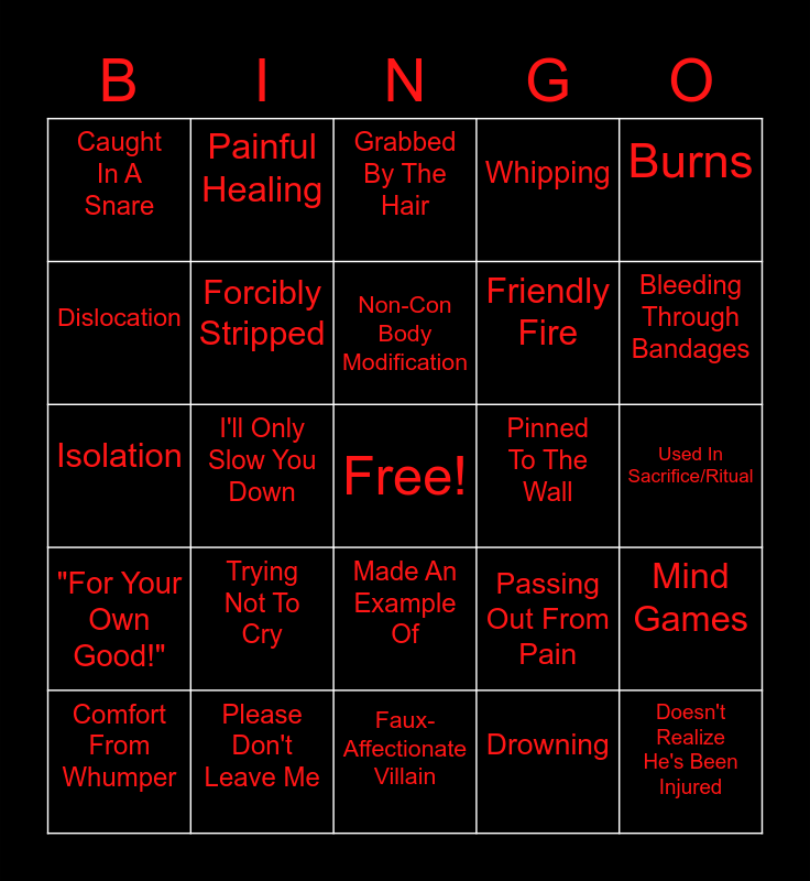 This bingo card has a free space and 24 words: Trying Not To Cry, Please Don't Leave Me, Non-Con Body Modification, Comfort From Whumper, Burns, Caught In A Snare, Dislocation, Painful Healing, Pinned To The Wall, Made An Example Of, Friendly Fire, Isolation, Passing Out From Pain, Mind Games, Forcibly Stripped, Drowning, Used In Sacrifice/Ritual, Grabbed By The Hair, Bleeding Through Bandages, I'll Only Slow You Down, Doesn't Realize He's Been Injured, "For Your Own Good!", Whipping and Faux- Affectionate Villain.