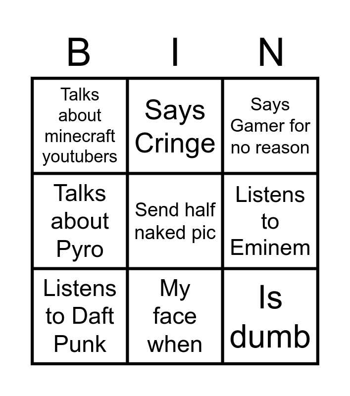 This bingo card has a free space and 8 words: Listens to Eminem, Says Gamer for no reason, Says Cringe, Listens to Daft Punk, Talks about minecraft youtubers, Is dumb, Talks about Pyro and My face when.