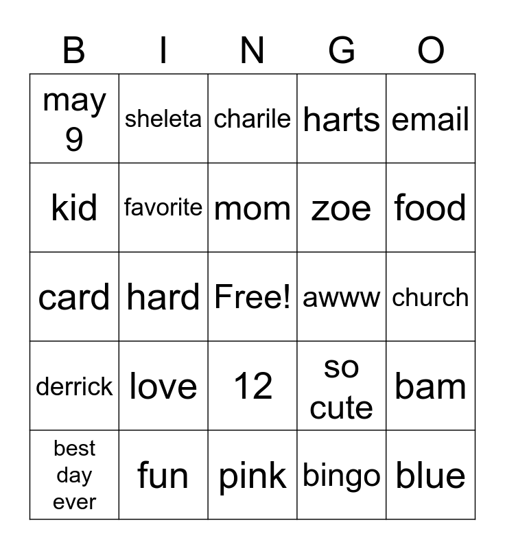 This bingo card has a free space and 24 words: love, fun, mom, best day ever, email, may 9, kid, sheleta, awww, 12, zoe, card, so cute, bam, favorite, bingo, church, charile, food, hard, blue, derrick, harts and pink.