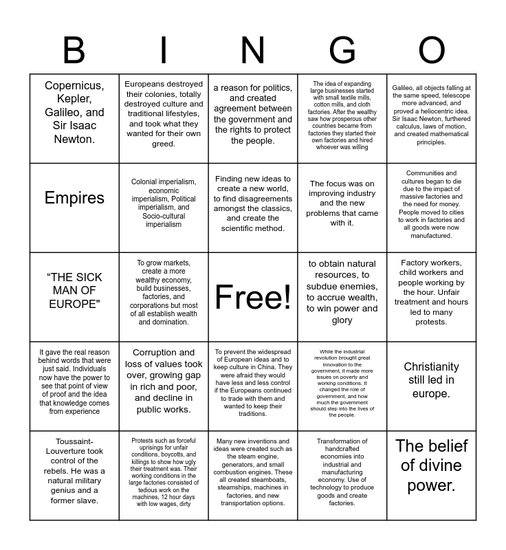 This bingo card has a free space and 24 words: Corruption and loss of values took over, growing gap in rich and poor, and decline in public works., Protests such as forceful uprisings for unfair conditions, boycotts, and killings to show how ugly their treatment was. Their working conditions in the large factories consisted of tedious work on the machines, 12 hour days with low wages, dirty, Finding new ideas to create a new world, to find disagreements amongst the classics, and create the scientific method., Toussaint-Louverture took control of the rebels. He was a natural military genius and a former slave., Galileo, all objects falling at the same speed, telescope more advanced, and proved a heliocentric idea. Sir Isaac Newton, furthered calculus, laws of motion, and created mathematical principles., Copernicus, Kepler, Galileo, and Sir Isaac Newton., Empires, Europeans destroyed their colonies, totally destroyed culture and traditional lifestyles, and took what they wanted for their own greed., to obtain natural resources, to subdue enemies, to accrue wealth, to win power and glory, To prevent the widespread of European ideas and to keep culture in China. They were afraid they would have less and less control if the Europeans continued to trade with them and wanted to keep their traditions., The focus was on improving industry and the new problems that came with it., “THE SICK MAN OF EUROPE", While the industrial revolution brought great innovation to the government, it made more issues on poverty and working conditions. It changed the role of government, and how much the government should step into the lives of the people., Christianity still led in europe., Colonial imperialism, economic imperialism, Political imperialism, and Socio-cultural imperialism, Transformation of handcrafted economies into industrial and manufacturing economy. Use of technology to produce goods and create factories., Factory workers, child workers and people working by the hour. Unfair treatment and hours led to many protests., a reason for politics, and created agreement between the government and the rights to protect the people., Communities and cultures began to die due to the impact of massive factories and the need for money. People moved to cities to work in factories and all goods were now manufactured., To grow markets, create a more wealthy economy, build businesses, factories, and corporations but most of all establish wealth and domination., The belief of divine power., It gave the real reason behind words that were just said. Individuals now have the power to see that point of view of proof and the idea that knowledge comes from experience, The idea of expanding large businesses started with small textile mills, cotton mills, and cloth factories. After the wealthy saw how prosperous other countries became from factories they started their own factories and hired whoever was willing and Many new inventions and ideas were created such as the steam engine, generators, and small combustion engines. These all created steamboats, steamships, machines in factories, and new transportation options..