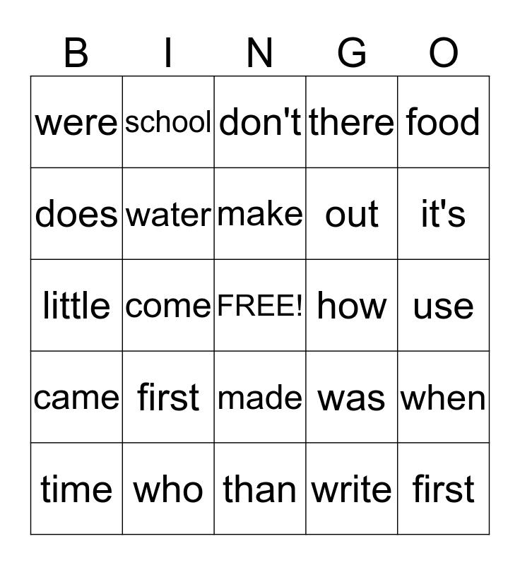 This bingo card has a free space and 24 words: first, who, make, time, food, were, does, school, how, made, out, little, was, when, water, write, use, don't, it's, come, first, came, there and than.