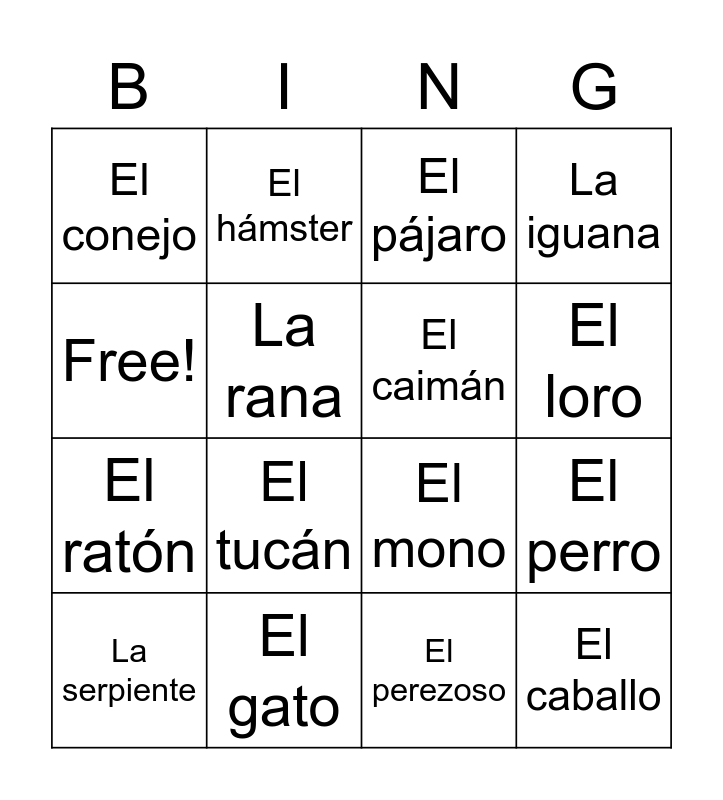This bingo card has 16 words: El gato, El perro, El pájaro, El conejo, El ratón, El hámster, El mono, El perezoso, Free!, La rana, La serpiente, La iguana, El tucán, El loro, El caimán and El caballo.