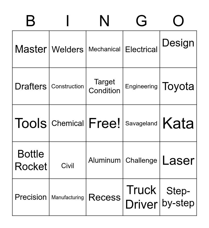 This bingo card has a free space and 24 words: Civil, Manufacturing, Target Condition, Precision, Design, Master, Drafters, Welders, Savageland, Aluminum, Engineering, Tools, Challenge, Laser, Construction, Truck Driver, Kata, Mechanical, Toyota, Chemical, Step-by-step, Bottle Rocket, Electrical and Recess.