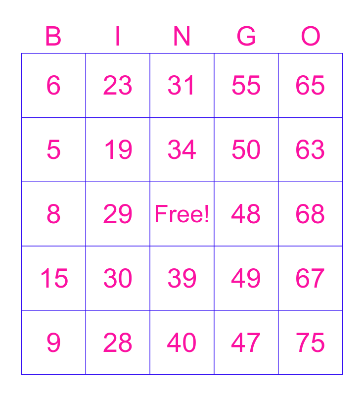 This bingo card has a free space and 75 words: 1, 16, 31, 46, 61, 2, 17, 32, 47, 62, 3, 18, 48, 63, 4, 19, 33, 49, 64, 5, 20, 34, 50, 65, 6, 21, 35, 51, 66, 7, 22, 36, 52, 67, 8, 23, 37, 53, 68, 9, 24, 38, 54, 69, 10, 25, 39, 55, 70, 11, 26, 40, 56, 71, 12, 27, 41, 57, 72, 13, 28, 42, 58, 73, 14, 29, 43, 59, 74, 15, 30, 44, 60, 75 and 45.