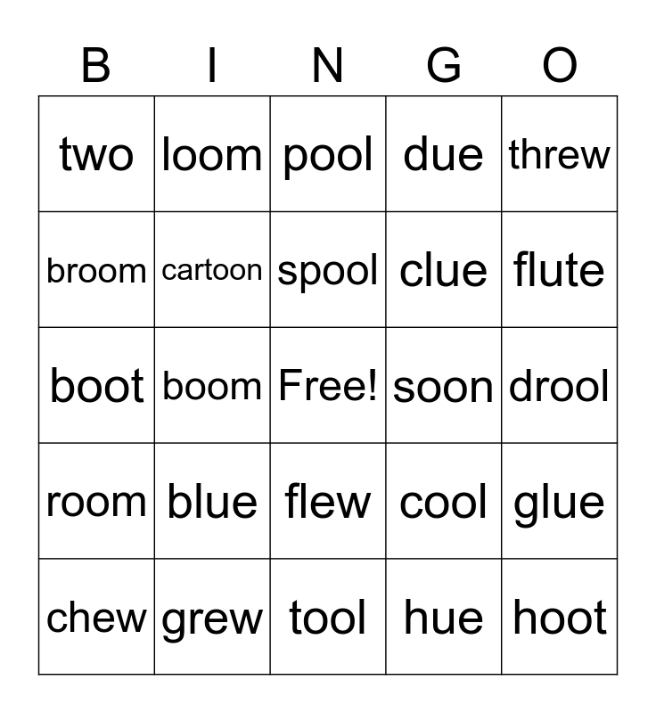 This bingo card has a free space and 24 words: blue, grew, spool, chew, threw, two, broom, loom, soon, flew, clue, boot, cool, glue, cartoon, hue, drool, pool, flute, boom, hoot, room, due and tool.