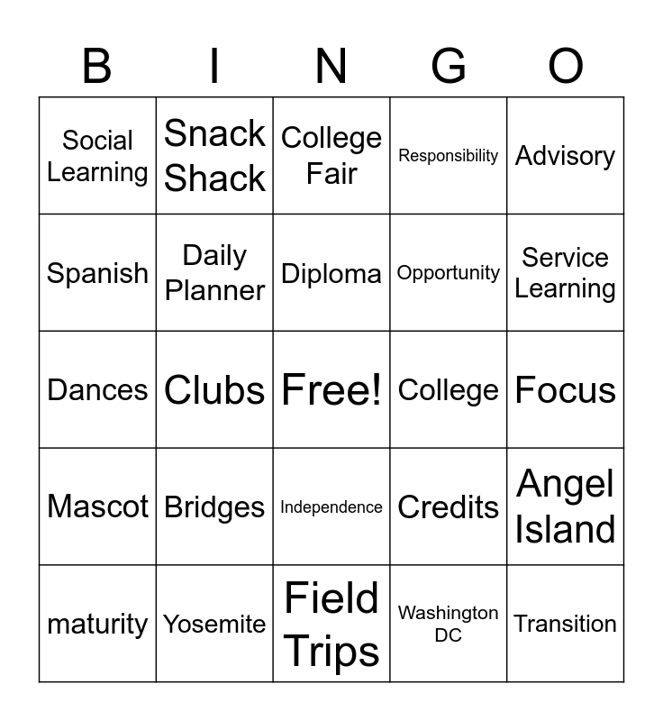 This bingo card has a free space and 39 words: diploma, Projects, Google Classroom, Daily Planner, maturity, Independence, Diploma, Self-advocacy, Advisory, Mascot, Clubs, Responsibility, Transition, Focus, College, Bridges, GPA, Social Learning, Education, Credits, Spanish, Field Trips, Opportunity, Service Learning, Goals, Determination, Sports, Schedule, Student Government, Snack Shack, Student News, Alumni Panel, College Fair, Yosemite, Washington DC, Experientials, Angel Island, Dances and Class Dojo.
