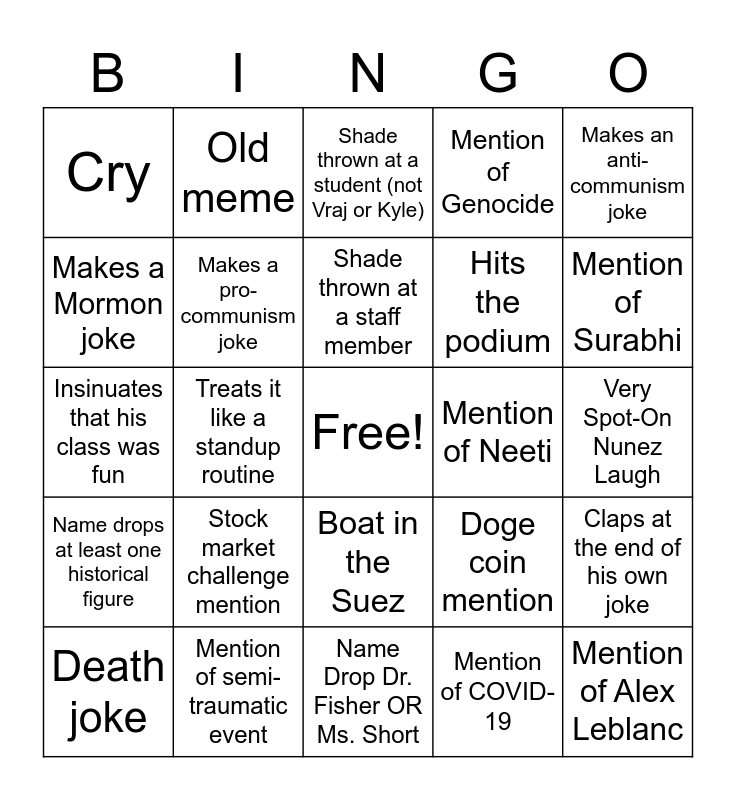 This bingo card has a free space and 34 words: Racially insensitive joke, Mention of COVID-19, Mentions Vraj, Mentions Kyle, Name drops at least one historical figure, Makes a pro-communism joke, Makes an anti-communism joke, Death joke, Old meme, Mention of relatively new meme that has been ruined, Shade thrown at a staff member, Shade thrown at a student (not Vraj or Kyle), Mentions his kid, Makes a joke about child abuse, Mention of Neeti, Mention of Surabhi, Mention of semi-traumatic event, Insinuates that his class was fun, Stock market challenge mention, Doge coin mention, Boat in the Suez, It sounds like a redone version of "We Didn't Start the Fire", Cry, Very Spot-On Nunez Laugh, Name Drop Dr. Fisher OR Ms. Short, Mention of Alex Leblanc, Mention of Genocide, World War II joke, Hits the podium, Makes a Mormon joke, Says the word "roast", Treats it like a standup routine, Claps at the end of his own joke and Mentions that no one wants to be there.