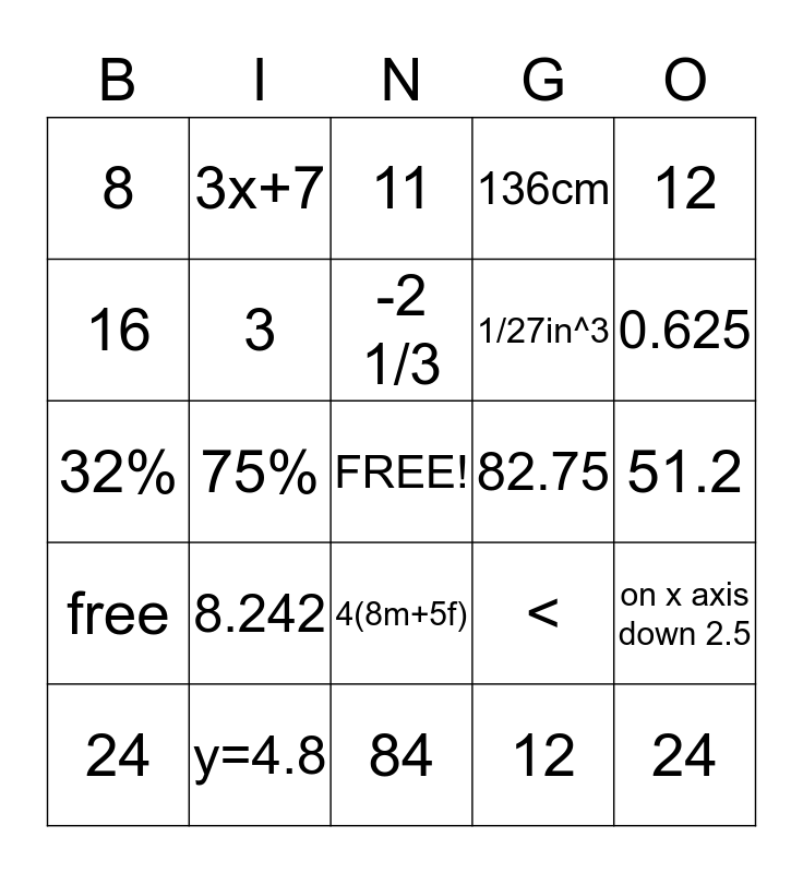 This bingo card has a free space and 24 words: 8.242, y=4.8, -2 1/3, 24, 12, 8, 16, 3x+7, 82.75, 4(8m+5f), 1/27in^3, 32%, <, on x axis down 2.5, 3, 12, 51.2, 11, 0.625, 75%, 24, free, 136cm and 84.