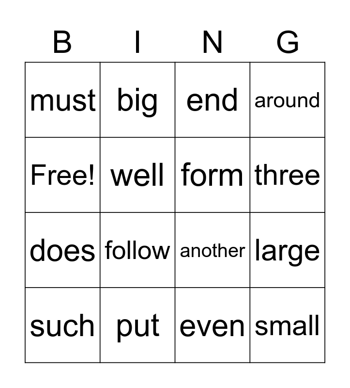This bingo card has 16 words: put, large, end, must, does, big, another, even, Free!, well, such, around, follow, three, form and small.