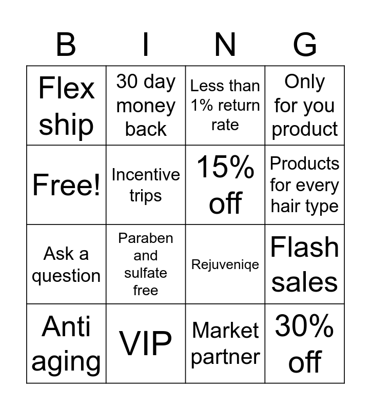 This bingo card has 16 words: VIP, Flash sales, Less than 1% return rate, Flex ship, Ask a question, 30 day money back, Rejuveniqe, Market partner, Free!, Incentive trips, Anti aging, Only for you product, Paraben and sulfate free, Products for every hair type, 15% off and 30% off.