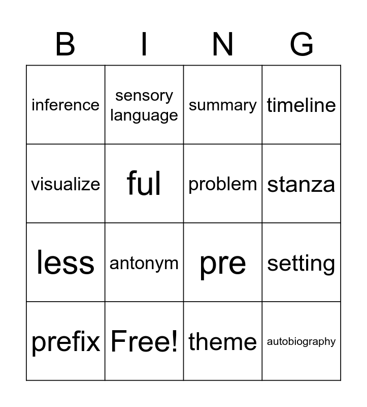 This bingo card has 29 words: fiction, nonfiction, setting, narrator, inference, summary, problem, solution, Free!, author, theme, prefix, suffix, synonym, antonym, main idea, biography, autobiography, visualize, pre, dis, re, less, ful, timeline, sensory language, narrative poem, stanza and onomatopoeia.