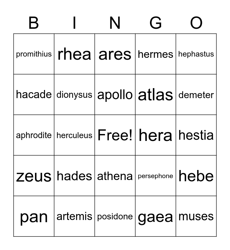 This bingo card has a free space and 24 words: pan, hades, apollo, gaea, hephastus, promithius, rhea, ares, hera, hestia, aphrodite, dionysus, persephone, hebe, hacade, artemis, posidone, hermes, demeter, zeus, herculeus, athena, atlas and muses.