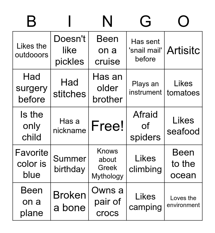 This bingo card has a free space and 24 words: Summer birthday, Broken a bone, Has an older brother, Been on a plane, Artisitc, Likes the outdooors, Had surgery before, Doesn't like pickles, Afraid of spiders, Knows about Greek Mythology, Plays an instrument, Is the only child, Likes climbing, Been to the ocean, Had stitches, Likes camping, Likes seafood, Been on a cruise, Likes tomatoes, Has a nickname, Loves the environment, Favorite color is blue, Has sent 'snail mail' before and Owns a pair of crocs.