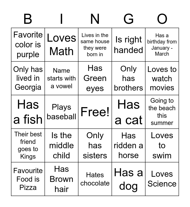 This bingo card has a free space and 24 words: Is the middle child, Has Brown hair, Has Green eyes, Favourite Food is Pizza, Has a birthday from January - March, Favorite color is purple, Only has lived in Georgia, Loves Math, Has a cat, Only has sisters, Only has brothers, Has a fish, Has ridden a horse, Loves to swim, Name starts with a vowel, Has a dog, Going to the beach this summer, Lives in the same house they were born in, Loves to watch movies, Plays baseball, Loves Science, Their best friend goes to Kings, Is right handed and Hates chocolate.