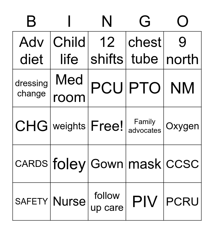 This bingo card has a free space and 24 words: foley, Nurse, PCU, SAFETY, 9 north, Adv diet, dressing change, Child life, Family advocates, Gown, PTO, CHG, mask, CCSC, Med room, PIV, Oxygen, 12 shifts, NM, weights, PCRU, CARDS, chest tube and follow up care.
