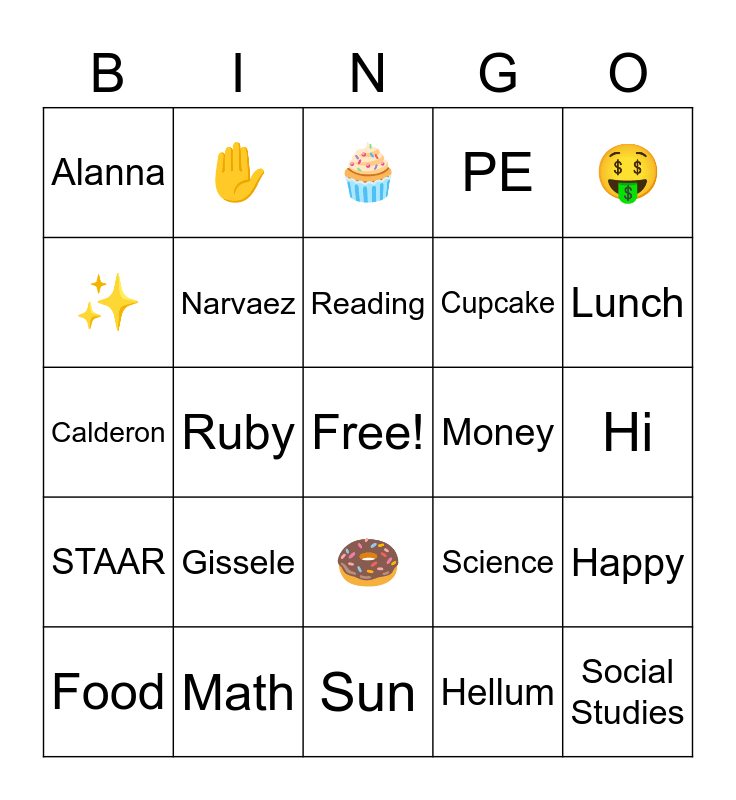 This bingo card has a free space and 24 words: Gissele, Math, Reading, Food, 🤑, Alanna, ✨, ✋, Money, 🍩, Cupcake, Calderon, Science, Happy, Narvaez, Hellum, Hi, 🧁, Lunch, Ruby, Social Studies, STAAR, PE and Sun.