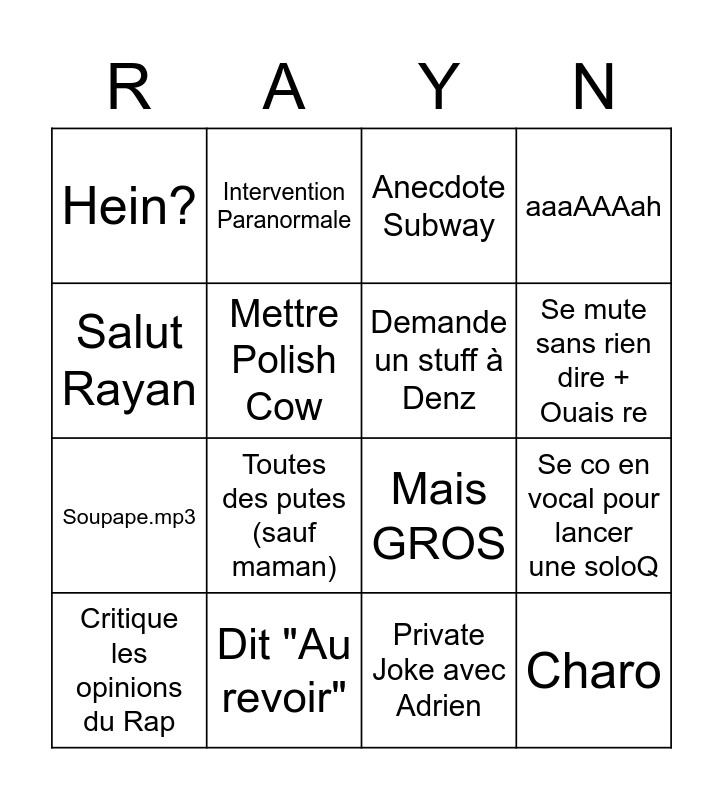 This bingo card has 16 words: Dit "Au revoir", Se co en vocal pour lancer une soloQ, Anecdote Subway, Hein?, Soupape.mp3, Intervention Paranormale, Mais GROS, Private Joke avec Adrien, Salut Rayan, Mettre Polish Cow, Critique les opinions du Rap, aaaAAAah, Toutes des putes (sauf maman), Se mute sans rien dire + Ouais re, Demande un stuff à Denz and Charo.