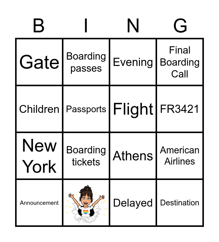 This bingo card has 1 images and 20 words: Weather, Boarding passes, Ready, Delayed, Flight, Gate, Evening, Athens, FR3421, New York, Final Boarding Call, Destination, Safe, Passports, Five, Announcement, Boarding tickets, Children, American Airlines and Thank you.
