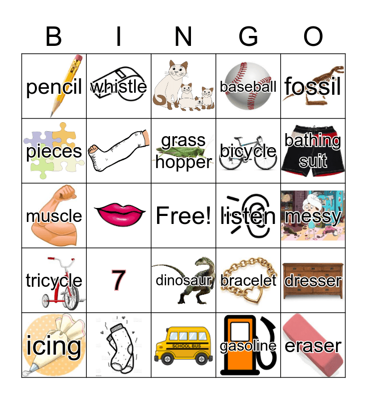 This bingo card has 23 images, a free space and 19 words: 7, grass hopper, icing, fossil, pencil, pieces, whistle, listen, dinosaur, bicycle, muscle, bracelet, dresser, gasoline, messy, bathing suit, eraser, tricycle and baseball.