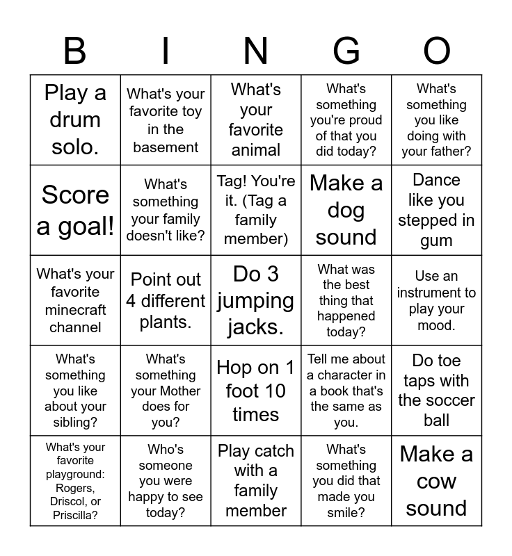 This bingo card has a free space and 24 words: What's something your Mother does for you?, Who's someone you were happy to see today?, Tag! You're it. (Tag a family member), What's your favorite playground: Rogers, Driscol, or Priscilla?, What's something you like doing with your father?, Play a drum solo., Score a goal!, What's your favorite toy in the basement, What was the best thing that happened today?, Hop on 1 foot 10 times, Make a dog sound, What's your favorite minecraft channel, Tell me about a character in a book that's the same as you., Do toe taps with the soccer ball, What's something your family doesn't like?, What's something you did that made you smile?, Use an instrument to play your mood., What's your favorite animal, Dance like you stepped in gum, Point out 4 different plants., Make a cow sound, What's something you like about your sibling?, What's something you're proud of that you did today? and Play catch with a family member.