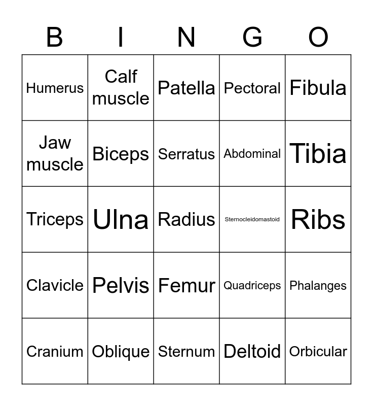 This bingo card has 25 words: Pelvis, Sternum, Serratus, Cranium, Fibula, Humerus, Jaw muscle, Calf muscle, Sternocleidomastoid, Femur, Abdominal, Triceps, Quadriceps, Phalanges, Biceps, Orbicular, Ribs, Patella, Tibia, Ulna, Radius, Oblique, Clavicle, Pectoral and Deltoid.