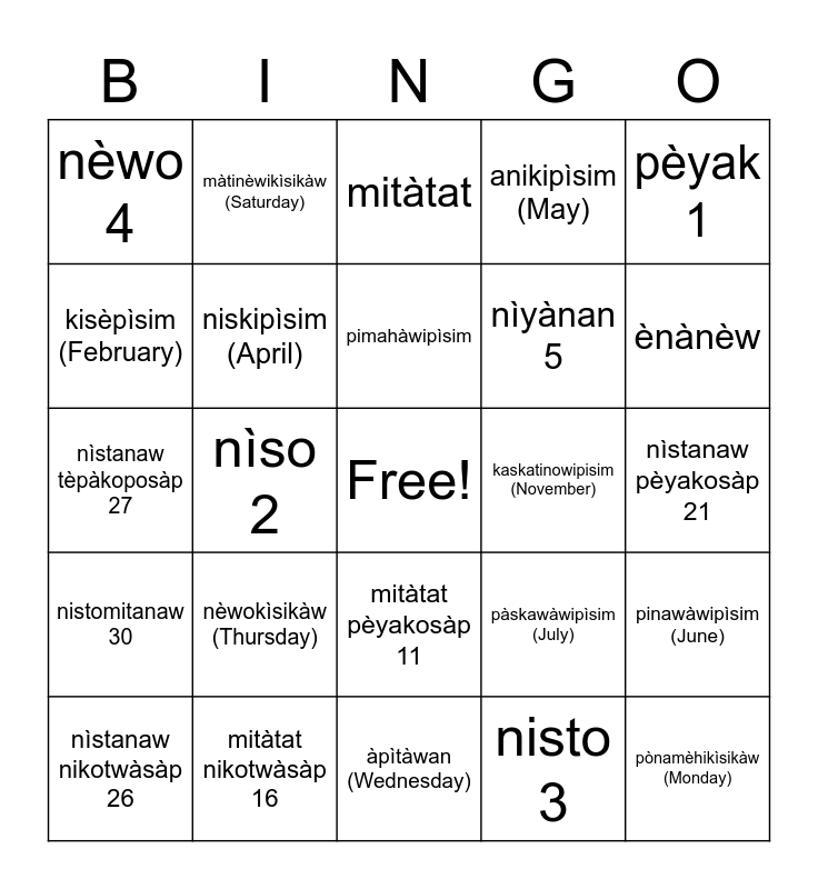 This bingo card has a free space and 50 words: ayamihèkìsikàw (Sunday), pònamèhikìsikàw (Monday), nìsokìsikàw (Tuesday), àpìtàwan (Wednesday), nèwokìsikàw (Thursday), nìyànokìsikàw (Friday), màtinèwikìsikàw (Saturday), pawacikwanàsìs, kisèpìsim (February), mikisiwipìsim (March), niskipìsim (April), anikipìsim (May), pinawàwipìsim (June), pàskawàwipìsim (July), opahòwipìsim (August), nòcitowipìsim (September), pimahàwipìsim, kaskatinowipisim (November), ninikopìwipisim (December), pèyak 1, nìso 2, nisto 3, nèwo 4, nìyànan 5, nikotwàsik 6, tèpakop 7, ènànèw, kèkàc mitàtat 9, mitàtat, mitàtat pèyakosàp 11, mitàtat nìsosàp, mitàtat nistosàp 13, mitàtat nèwosàp 14, mitàtat nìyànosàp 15, mitàtat nikotwàsàp 16, mitàtat tèpàkoposàp 17, mitàtat ayinànèwosap 18, kèkàc nìstanaw, nìstanaw 20, nìstanaw pèyakosàp 21, nìstanaw nìsosàp 22, nìstanaw nistosàp 23, nìstanaw nèwosàp 24, nìstanaw nìyànosàp 25, nìstanaw nikotwàsàp 26, nìstanaw tèpàkoposàp 27, nìstanaw ayinànèwosap 28, kèkàc nistomitanaw 29, nistomitanaw 30 and nistomitanawpèyakosàp 31.