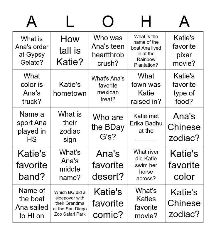 This bingo card has a free space and 29 words: Name of the boat Ana sailed to HI on, Ana's hometown, What is their zodiac sign, Name the instrument Ana played growing up, What is Ana's order at Gypsy Gelato?, Who was Ana's teen heartthrob crush?, Katie's hometown, What's Ana's middle name?, Katie met Erika Badhu at the ______, Which BG did a sleepover with their Grandma at the San Diego Zoo Safari Park, Ana's Chinese zodiac?, Katie's Chinese zodiac?, Katie's favorite comic?, What's Katies favorite movie?, Katie's favorite type of food?, What mainland offering have all Ana's guests brought to her?, Ana's favorite desert?, Katie's favorite band?, Katie's favorite pixar movie?, Name a sport Ana played in HS, What river did Katie swim her horse across?, Where did Ana live before HI?, What town was Katie raised in?, What color is Ana's truck?, What is the name of the boat Ana lived in at the Rainbow Plantation?, How tall is Katie?, Katie's favorite color, What's Ana's favorite mexican treat? and How many siblings do the BG's have?.