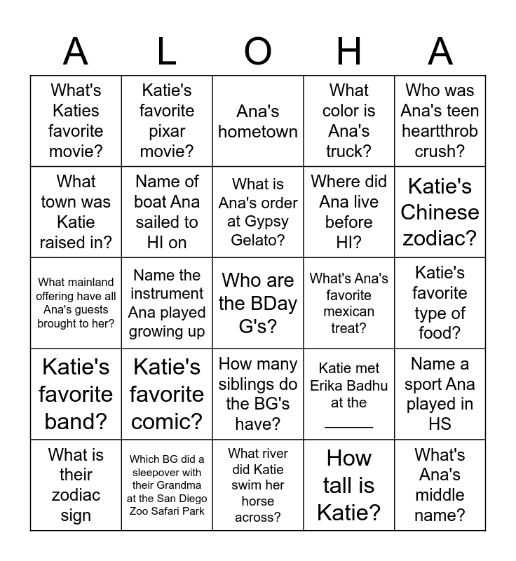 This bingo card has a free space and 29 words: What is their zodiac sign, Katie's favorite color, Name the instrument Ana played growing up, What is the name of the boat Ana lived in at the Rainbow Plantation?, What's Katies favorite movie?, Ana's hometown, Name of boat Ana sailed to HI on, Katie's favorite comic?, What's Ana's favorite mexican treat?, Which BG did a sleepover with their Grandma at the San Diego Zoo Safari Park, Katie's favorite type of food?, What's Ana's middle name?, What river did Katie swim her horse across?, How tall is Katie?, Katie's Chinese zodiac?, Ana's Chinese zodiac?, How many siblings do the BG's have?, Katie's favorite band?, Who was Ana's teen heartthrob crush?, What mainland offering have all Ana's guests brought to her?, Katie met Erika Badhu at the ______, Ana's favorite desert?, Where did Ana live before HI?, What town was Katie raised in?, What color is Ana's truck?, Katie's favorite pixar movie?, Name a sport Ana played in HS, What is Ana's order at Gypsy Gelato? and Katie's hometown.