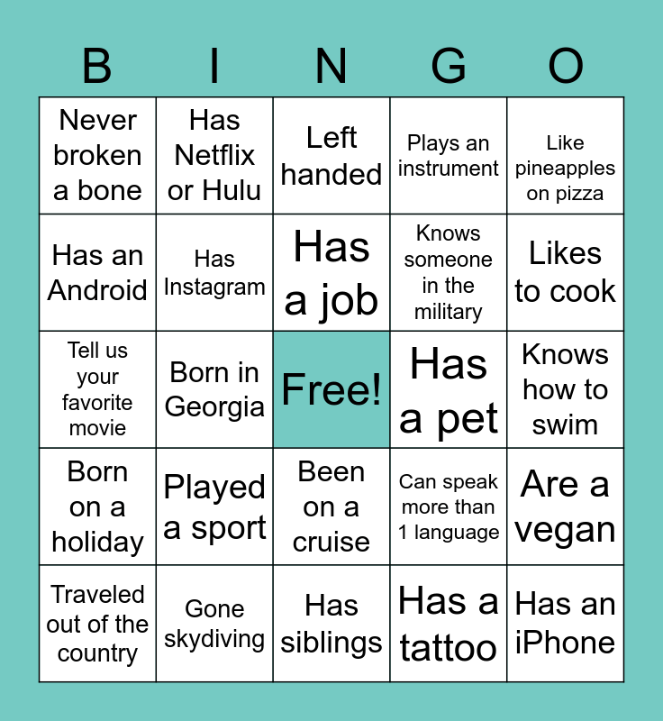 This bingo card has a free space and 24 words: Traveled out of the country, Played a sport, Has a job, Has a tattoo, Like pineapples on pizza, Never broken a bone, Has Netflix or Hulu, Left handed, Has a pet, Knows how to swim, Tell us your favorite movie, Has Instagram, Can speak more than 1 language, Are a vegan, Has an Android, Gone skydiving, Has siblings, Plays an instrument, Likes to cook, Born on a holiday, Born in Georgia, Been on a cruise, Knows someone in the military and Has an iPhone.