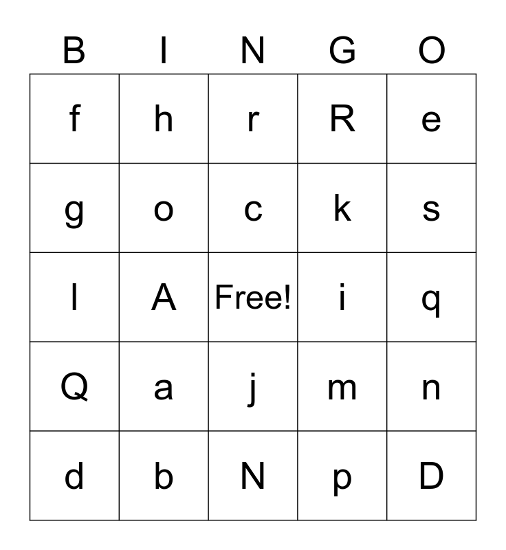 This bingo card has a free space and 24 words: a, b, c, d, e, f, g, h, i, j, k, l, m, n, o, p, q, r, s, A, D, Q, R and N.