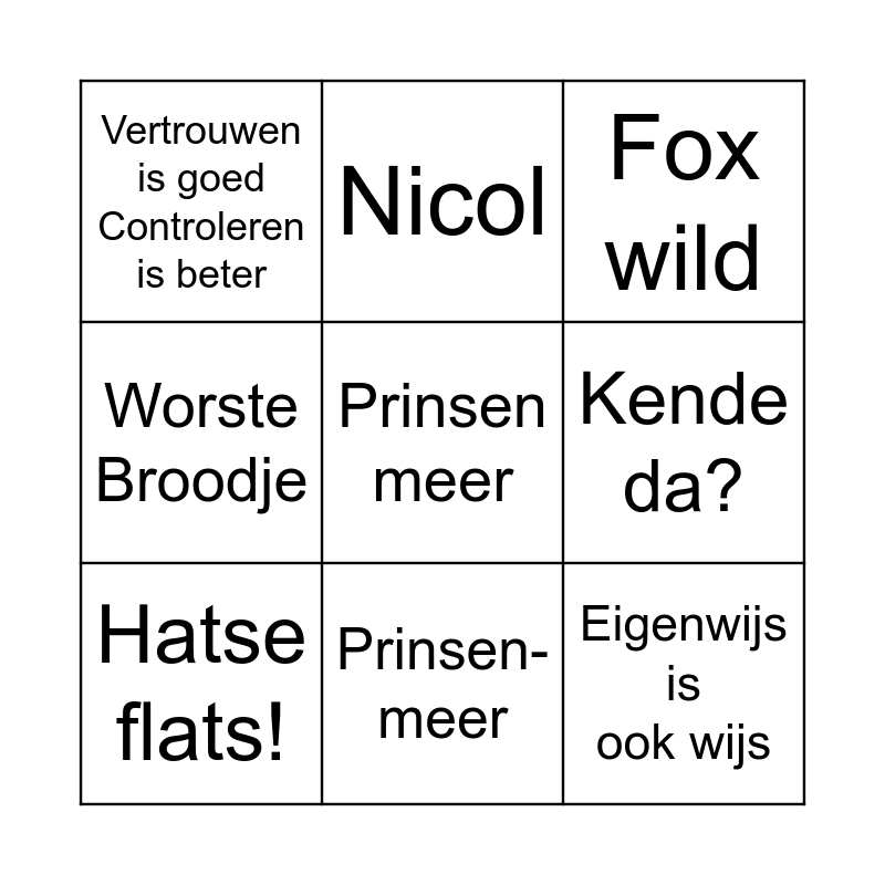 This bingo card has a free space and 9 words: Hatse flats!, Fox wild, Nicol, Worste Broodje, Vertrouwen is goed Controleren is beter, Kende da?, Eigenwijs is ook wijs, Massa is kassa and Prinsen- meer.